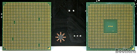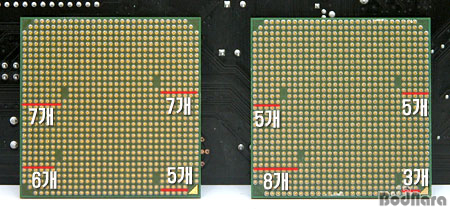 ¼ÒÄÏ AM2 ¹æ½Ä AThlon64 FX-62(ÁÂ)¿Í ¼ÒÄÏ 939 ¹æ½Ä AThlon64 FX-60(¿ì)ÀÇ ºñ±³ »çÁø, ÇÏ´Ü À̹ÌÁö´Â ÇÁ·Î¼¼¼­ ÇÏ´ÜÀÇ ÇÉ ¹è¿­Áß ÇÉÀÌ ¾ø´Â °ø¹éºÎºÐÀÇ À§Ä¡¸¦ ¹Ù±ùÂÊ ÇɱîÁöÀÇ Çɰ¹¼ö¸¦ ÅëÇØ ºñ±³ÇÑ °ÍÀ¸·Î ¼ÒÄÏ AM2¿Í ¼ÒÄÏ 939 ¹æ½ÄÀÇ Çɹ迭 Â÷À̸¦ º¸¿©ÁÖ±â À§ÇØ ºñ±³ÇÑ °ÍÀÌ´Ù.