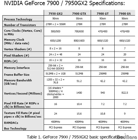 À§ÀÇ Ç¥´Â nVIDIAÀÇ GeForce 7900 GS ¸®ºä °¡À̵忡 Æ÷ÇÔµÈ 7900 Á¦Ç°±º°£ÀÇ ½ºÆå ºñ±³Ç¥·Î½á GeForce 7900 GS´Â ±âÁ¸ 7900 GT¿Í µ¿ÀÏÇÑ Å¬·°°ú ¸Þ¸ð¸® ±¸¼ºÀ¸·Î ¸¸µé¾îÁø Á¦Ç°ÀÌÁö¸¸ GPU ³»ºÎÀÇ Çȼ¿ ÆÄÀÌÇÁ¶óÀΰú ¹öÅØ½º ÆÄÀÌÇÁ¶óÀÎÀÇ ±¸¼ºÀ» º¯°æ½ÃÄÑ Ãâ½ÃÇÑ Á¦Ç°ÀÌ´Ù.