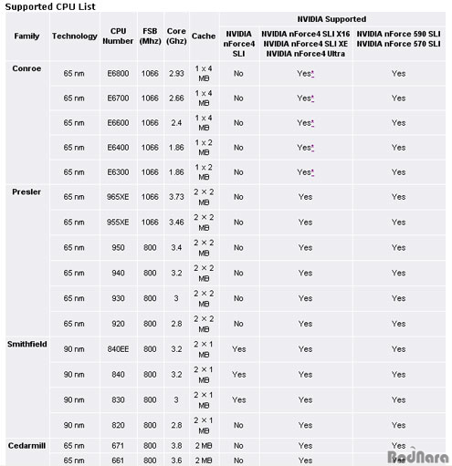 Smithfield, Cedarmill µî°ú CeleronD CPUµéµµ ¸ðµÎ Áö¿øÇÒ ¼ö ÀÖµµ·Ï µÇ¾î ÀÖ´Ù. ±âÁ¸ÀÇ Á¦Ç° Áß nForce4 SLI XE´Â Conroe¸¦ Áö¿øÇÏÁö ¸øÇϸç,