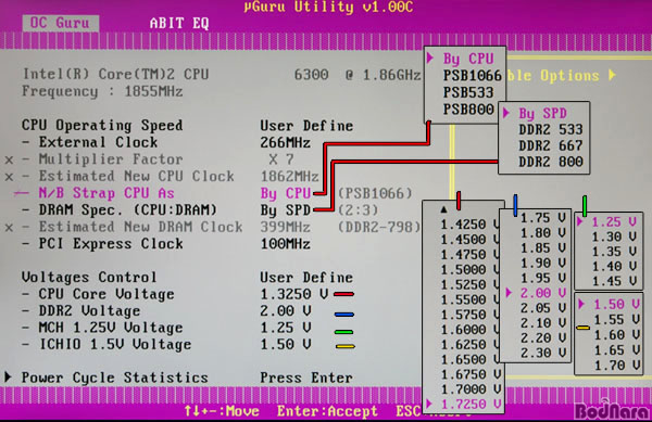 ¿À¹öŬ·°°ú Àü¾Ð Á¶Àý¿¡ °ü·ÃµÈ ¿É¼ÇÀº ¹ÙÀÌ¿À½ºÀÇ µÎ¹øÂ° ¸Þ´ºÀÎ Advanced¿¡ ¸ð¿©Àִµ¥, FSB Á¶ÀýÀº 100~600MHz±îÁö °¡´ÉÇÏ¸ç ¸Þ¸ð¸® ºñÀ² ¼³Á¤Àº °ø½Ä ¸Þ¸ð¸®ÀÎ DDR2-533, 667, 800 »Ó¸¸ ¾Æ´Ï¶ó 889, 1067°°Àº ºñ°ø½Ä ºñÀ²µµ Áö¿øÇÑ´Ù. PCI Ŭ·° °íÁ¤À» ¸Þ´º¿¡¼­ ¼±ÅÃÇÒ ¼ö ÀÖÀ¸¸ç, Àü¾Ð Á¶ÀýÀº CPU, ¸Þ¸ð¸®, FSB, NB, SB, ICH µî 6°³ Ç׸ñÀ̳ª Áö¿øÇϰí ÀÖ´Ù. ÀÚ¼¼ÇÑ ¿É¼Ç ¼öÄ¡´Â ¾Æ·¡ÀÇ Ç¥¸¦ Âü°íÇϱ⠹ٶõ´Ù.