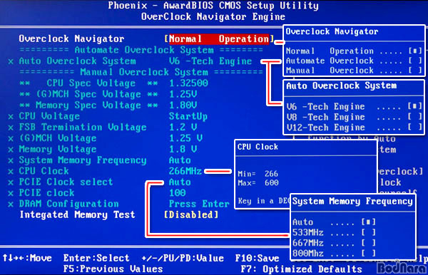 DREAM TF965P ConroeÀÇ ¿À¹öŬ·° ±â´ÉÀº OverClock Navigator Engine Ç׸ñ¿¡¼­ ¼³Á¤ÇÒ ¼ö Àִµ¥, ´Ü¼øÇÏ°Ô ¼öµ¿À¸·Î ³õ°í Á÷Á¢ ¿À¹öŬ·°À» ½Ãų ¼öµµ ÀÖÀ¸¸ç Automatic OverclockÀ» ¼±ÅÃÇϸé V6, V8, V12ÀÇ 3°¡Áö ¿É¼Ç¿¡ ÀÇÇØ ¸ÞÀκ¸µå¿¡¼­ ÀÚµ¿ ¿À¹öŬ·°À» ÇÏ°Ô µÈ´Ù. ¼öµ¿À¸·Î ³õ¾ÒÀ» ¶§ FSB´Â 266~600MHz±îÁö Áö¿øÇϸç CPU:¸Þ¸ð¸® ºñÀ²Àº °ø½Ä Áö¿øÇÏ´Â DDR2-533, 667, 800 ¸Þ¸ð¸® ¼³Á¤¸¸ °¡´ÉÇß´Ù. Àü¾Ð Á¶Àý ±â´ÉÀº CPU, ¸Þ¸ð¸®, FSB, MCH µî 4°¡Áö Ç׸ñÀ» Áö¿øÇϰí Àִµ¥ ¸ð´ÏÅ͸µ ¸Þ´º¸¦ °¡Áö ¾Ê°í ¿À¹öŬ·° ¸Þ´º¿¡¼­ CPU, MCH, ¸Þ¸ð¸® Àü¾ÐÀ» º¼ ¼ö ÀÖ°Ô ¸¸µé¾î Æí¸®ÇÏ´Ù. Integration Memory Test ¿É¼ÇÀ» µÎ¾î ¸ÞÀκ¸µå°¡ ºÎÆÃÇÒ ¶§ Ç÷¡½Ã¿¡ ³»ÀåµÈ ¸Þ¸ð¸® Å×½ºÆ® ÇÁ·Î±×·¥À» ½ÇÇà½Ãų ¼ö ÀÖ´Ù.