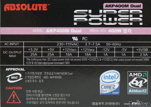 Ãø¸é¿¡ ºÙ¾îÀÖ´Â AC ÀԷ°ú DC Ãâ·Â¿¡ °üÇÑ ³»¿ë°ú MIC ÀÎÁõ ¸¶Å© ¹× ´Ù¾çÇÑ Á¤º¸°¡ Ç¥±âµÇ¾î ÀÖ´Ù. ATX12V v2.2¿¡¼­ ±ÔÁ¤ÇÏ´Â µÎ °³ÀÇ 12V Ãâ·ÂÀÇ ÃÖ´ë Çã¿ë Àü·ù´Â 18A·Î Ç¥±âµÇ¾î ÀÖÀ¸¸ç, +12V Ãâ·ÂÀº 348W¸¦ +3.3V¿Í +5VÀÇ Ãâ·ÂÀº 134W¸¦ ³ÑÀ» ¼ö ¾ø´Ù´Â ¹®±¸µµ È®ÀÎÇÒ ¼ö ÀÖ´Ù.