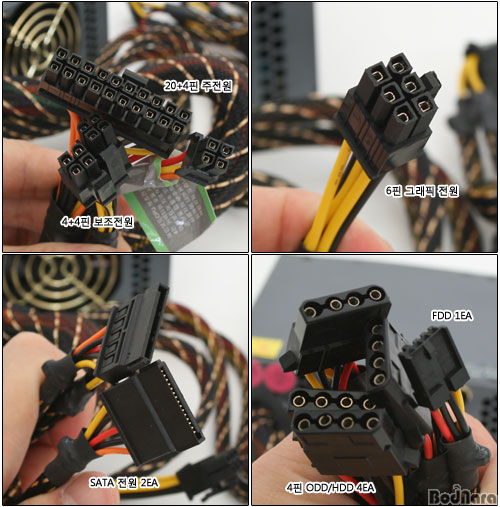 ÄÉÀ̺íÀÇ Á¤¸®°¡ ½±µµ·Ï ±×¹°¸Á 󸮰¡ µÈ ÄÉÀ̺íÀº 20+4ÇÉ ÁÖ Àü¿ø ÄÉÀ̺í°ú 4+4ÇÉ º¸Á¶Àü¿ø ÄÉÀ̺í·Î ´Ù¾çÇÑ ¸ÞÀκ¸µåÀÇ Àü¿øÀ» °ø±ÞÇÒ ¼ö ÀÖ°Ô ±¸¼ºµÇ¾î ÀÖ´Ù. ÀÌ ¿Ü¿¡µµ ±×·¡ÇÈ Ä«µå¿¡ Ãß°¡ Àü¿øÀ» °ø±ÞÇϱâ À§ÇÑ 6ÇÉ Àü¿ø, µÎ °³ÀÇ SATA Àü¿ø, 4°³ÀÇ HDD/ODD 4ÇÉ Àü¿ø Æ÷Æ® ¹× ÇÑ °³ÀÇ FDD Àü¿ø Æ÷Æ®¸¦ Áö¿øÇϰí ÀÖ´Ù.