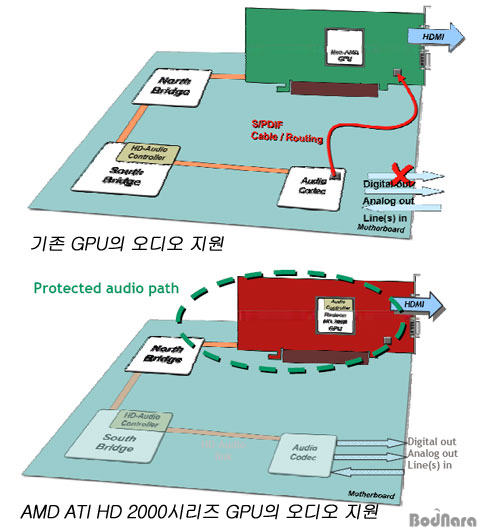 ±âÁ¸ ¹æ½ÄÀÇ GPUµéÀº HDMI¸¦ Áö¿øÇÏ¸é¼ ¿Àµð¿À¸¦ Áö¿øÇϱâ À§ÇØ ¸ÞÀκ¸µå¿¡ ¿Âº¸µåµÈ ¿Àµð¿À ÄÚµ¦°ú SPDIF ÄÉÀ̺íÀ»
