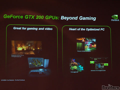 NVIDIA´Â GeForce GTX 200 ½Ã¸®Á ³»³õÀ¸¸é¼­ ÀÌÀü°ú ´Þ¸® GPU¸¦ ÀÌ¿ëÇÏ¿© °ÔÀÓ ±× ÀÌ»óÀÇ È°¿ëÀÌ °¡´ÉÇÔÀ» ¹àÈ÷°í ÀÖ´Ù. ±× À̸鿡´Â C¾ð¾î¸¦ ±â¹ÝÀ¸·Î Çϰí ÀÖ´Â CUDA°¡ Á߽ɿ¡ ÀÖ´Ù. NVIDIA´Â CUDA¸¦ ±â¹ÝÀ¸·Î GPU¸¦ ÀÌ¿ëÇÑ µ¿¿µ»ó ÀÎÄÚµùÀ̳ª PhysX ¹°¸®¿£Áø Á¢¸ñ µîÀÇ ´Ù¾çÇÑ ºÎºÐ¿¡¼­ÀÇ È°¿ë¼ºÀ» ³ôÀ̰í ÀÖ´Ù.