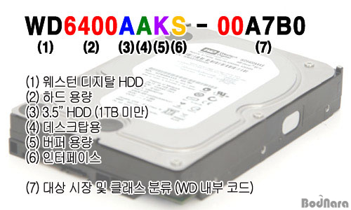WDÀÇ Çϵå´Â ÀϹÝÀûÀ¸·Î ¾Ë·ÁÁø ¹Ù·Î, ¸ðµ¨ ³Ñ¹ö °¡¿îµ¥ ù ¹øÂ° WD´Â ¿þ½ºÅÏ µðÁöÅ» HDD¶ó´Â ¶æÀ̰í, Áß°£ÀÇ ¼ýÀÚ´Â ÇϵåÀÇ ¿ë·®À» ÀǹÌÇÑ´Ù. ¼ýÀÚ µÚ¿¡ ºÙ´Â ¹®ÀÚ´Â Çϵå Á¾·ù³ª Ãâ½Ã ½Ã±â¿¡ µû¶ó¼­ Â÷À̰¡ ÀÖÁö¸¸ 640GB ¸ðµ¨¿¡ ÇÑÇØ¼­´Â óÀ½ A°¡ 1TB ÀÌÇÏÀÇ 3.5" HDD¶ó´Â Àǹ̰í, µÎ ¹øÂ° A´Â µ¥½ºÅ©Å¾¿ë Á¦Ç°À̶ó´Â ¶æÀÌ´Ù. ¼¼¹øÂ° K´Â ¹öÆÛ ¿ë·®À» ÀǹÌÇÏ´Â °ÍÀ¸·Î 2MB´Â B, 8MB´Â J, 16MB´Â K, 32MB´Â LÀ» »ç¿ëÇϸç, ¸¶Áö¸· S´Â ÇÏµå µð½ºÅ© ÀÎÅÍÆäÀ̽º·Î S´Â SATA 3.0Gbps, D´Â SATA 1.5Gbps, ±×¸®°í B´Â EIDE¿¡ ÇØ´çÇÑ´Ù.