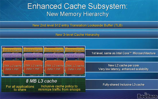 ij½Ã¸¦ Àüü °øÀ¯ÇÏ´Â ¹æ½ÄÀ¸·Î ¼³°èÇ߱⠶§¹®¿¡ 4°³ÀÇ Äھ ÃÖ´ë 8MBÀÇ L3 ij½Ã¸¦ °øÀ¯ÇÏ°Ô µÈ´Ù. »õ·Î Ãß°¡µÈ 256KB L2 ij½Ã´Â
