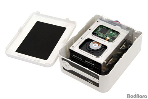 ÇÃ¶ó½ºÆ½ Ä¿¹ö¸¦ ¿¸é ¾È¿¡´Â 2°³ÀÇ HDD°¡ ÀåÂøµÇ´Â µå¶óÀÌºê º£ÀÌ¿Í ±× ¾Æ·¡ NAS ½Ã½ºÅÛ º¸µå°¡ º¸ÀδÙ.
