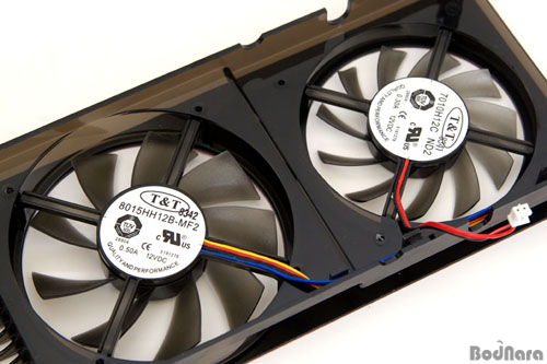 GPU ÂÊ¿¡´Â PWM ¹æ½ÄÀ¸·Î ÆÒ ¼Óµµ°¡ Á¶ÀýµÇ´Â 80mm ÆÒÀ» ´Þ°í, Àü¿øºÎ°¡ ÀÖ´Â µÞºÎºÐ¿¡´Â 2ÇÉ ±¸Á¶ÀÇ °íÁ¤ RPMÀ¸·Î µ¿ÀÛÇÏ´Â 70mm ÆÒÀ» ´Þ¾Æ ÇÑÂÊÀº GPU ¿Âµµ º¯È ¹× »ç¿ë·ü¿¡ µû¶ó ÆÒ ¼Óµµ°¡ Á¶ÀýµÇ°í °è¼Ó Àü¿øÀ» °ø±ÞÇØÁà¾ß ÇÏ¸ç º°°³ÀÇ È÷Æ®½ÌÅ©°¡ µû·Î ´Þ¸° Àü¿øºÎ¸¦ ´ã´çÇÑ ÂÊÀº °íÁ¤ ¼Óµµ·Î ÀÏÁ¤ÇÑ Ç³·®À» ³»°í ÀÖ´Ù.