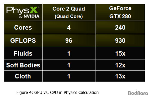 NVIDIA PhysX°¡ ³»¼¼¿ì´Â ¶Ç ÇϳªÀÇ ÀåÁ¡Àº GPUÀÇ ¿¬»ê ´É·ÂÀÌ CPUº¸´Ù ¿ì¼öÇϱ⠶§¹®¿¡ GPU¸¦ ÅëÇØ PhysX ¹°¸®¿£ÁøÀ» °¡¼ÓÇϸé CPUº¸´Ù ¶Ù¾î³ ó¸® ´É·ÂÀ» °¡Áø´Ù´Â °ÍÀÌ´Ù. ÀÌ´Â GPU°¡ ÇöÀçÀÇ Äõµå ÄÚ¾î CPU ´ëºñ ´õ ¸¹Àº ÄÚ¾î¿Í ºÎµ¿¼Ò¼öÁ¡ ó¸® ´É·Â (GFLOPS)¸¦ °®Ãß°í ÀÖ¾î ó¸® ´É·Â¿¡¼´Â ÃÖ´ë 15¹è±îÁö Â÷À̸¦ ³»ÁÖ°í ÀÖ°í ÀÌ´Â CPU¸¦ ÀÌ¿ëÇÏ´Â °Íº¸´Ù ´õ ¸¹Àº ¹°¸®È¿°úµéÀ» Àû¿ëÇÏ¸é¼ ´õ ³ªÀº ¼º´ÉÀ» ¾òÀ» ¼ö ÀÖ´Ù´Â Á¡ÀÌ´Ù.