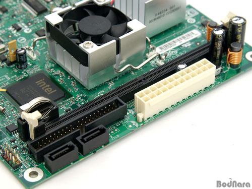 D945GCLF2´Â DDR2-667/533 ¸Þ¸ð¸®¸¦ Áö¿øÇÏ´Â 1°³ÀÇ ¸Þ¸ð¸® ½½·ÔÀ» °¡Áö°í ÀÖ´Ù. ÀÌ ¶§¹®¿¡ µà¾ó ä³Î ¸Þ¸ð¸® ±¸¼ºÀº ÇÒ ¼ö ¾ø´Âµ¥, i945GCÀÇ ³»Àå ±×·¡ÇÈ GMA 950À» À§ÇÑ ¹öÆÛ ¸Þ¸ð¸®µµ ¿©±â¼ ÇÒ´çÇϱ⠶§¹®¿¡ Á¶±Ý ¾Æ½¬¿î ±¸¼ºÀÌ´Ù. ÃÖ´ë 2GB ¸Þ¸ð¸® ¸ðµâÀ» ÀåÂøÇÒ ¼ö ÀÖ´Ù.  ¸Þ¸ð¸® ½½·Ô ¿·À¸·Î´Â ATX 24ÇÉ Àü¿ø Ä¿³ØÅÍ¿Í SATA II Æ÷Æ® 2°³, IDE ä³Î 1°³¸¦ ¹èÄ¡Çß´Ù. ±¸Çü Mini-ITX º¸µå¿Í ´Þ¸® ÃÑ 4°³ÀÇ ÀåÄ¡¸¦ ¿¬°áÇÏ°Ô µÇ¸ç ÃֽŠSATA II ÀÎÅÍÆäÀ̽º Áö¿ø Á¦Ç°À» ´Þ ¼ö ÀÖ´Ù´Â °ÍÀÌ ÀåÁ¡ÀÌ´Ù.