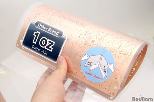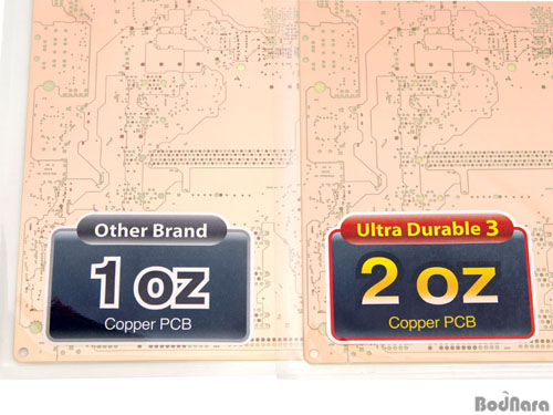 Ultra Durable 3¿¡ µé¾î°£ 2 oz ±â¼úÀ» °­Á¶Çϱâ À§ÇØ ±â°¡¹ÙÀÌÆ®¿¡¼­´Â ¸ÞÀκ¸µå ³»ºÎ¿¡ µé¾î°£ °Í°ú µ¿ÀÏÇÑ ±¸¸® PCB¸¦ ¸¶ÄÉÆÃ¿ë ŶÀ¸·Î ¸¸µé¾ú´Âµ¥, ¿©±â¿¡´Â ±âÁ¸ÀÇ ¸ÞÀκ¸µå¿¡¼­ ¾²ÀÌ´Â 1 oz ±¸¸® PCB¿Í Ultra Durable 3¿¡¼­ Àû¿ëµÈ 2 oz PCB°¡ ¸ðµÎ µé¾î°¡ À¯ÀúµéÀÌ Á÷Á¢ ¸¸Á®º¸°í ºñ±³ÇÒ ¼ö ÀÖ°Ô Çß´Ù.