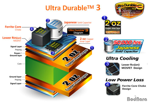 ±â°¡¹ÙÀÌÆ®¿¡¼­´Â Ultra Durable 3 ±â¼úÀÌ ±¸¸® Ä𸵠ȿ°ú¸¦ ³ôÀ̱â À§ÇØ ¸ÞÀκ¸µå Á¦Á¶¿¡ 2 ¿Â½º(ounce, oz)¿¡ ÇØ´çÇÏ´Â ±¸¸® ·¹À̾î¿Í 5¸¸ ½Ã°£ÀÇ ¼ö¸íÀ» °¡Áø ÀϺ»Á¦ ¼Ö¸®µå ijÆÐ½ÃÅÍ, Lower RDS (On) Mosfet, Ferrite Core ÃÊÅ© µîÀÌ µé¾î°£ °ÍÀ̶ó°í ¼³¸íÇϰí ÀÖ´Ù.