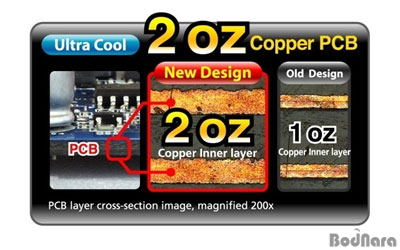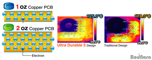 Ultra Durable 3¿¡¼­ »õ·Î µé¾î°£ 2 oz ±â¼úÀº ±âÁ¸ÀÇ ¸ÞÀκ¸µå Á¦Á¶½Ã PCB ·¹ÀÌ¾î »çÀÌ¿¡ µé¾î°¡´ø ±¸¸® PCB¸¦ 1 oz¿¡¼­ 2 oz·Î 2¹è Áõ°¡½ÃŲ °ÍÀÌ´Ù. oz´Â µÎ²²°¡ ¾Æ´Ï¶ó ¹«°Ô¸¦ ÁöĪÇÏ´Â ´ÜÀ§À̱⠶§¹®¿¡ 2 oz´Â Àüº¸´Ù 2¹è ¸¹Àº ±¸¸®¸¦ »ç¿ëÇØ PCB¸¦ ¸¸µé¾ú´Ù´Â ¶æÀÌÁö¸¸, °°Àº Å©±âÀÇ PCB¿¡ ±¸¸® ¾çÀ» 2¹è·Î ´Ã·ÈÀ¸´Ï ÀÚ¿¬È÷ µÎ²²µµ ±×¸¸Å­ µÎ²¨¿öÁö°Ô µÇ´Â °ÍÀÌ´Ù.