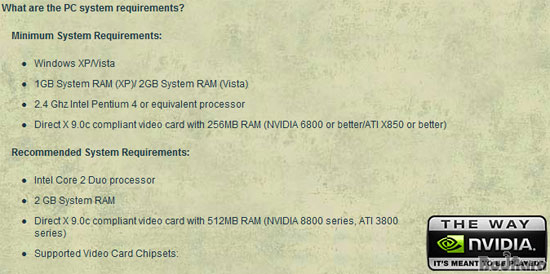 ±ÇÀå »ç¾çÀº À̺¸´Ù Á»´õ ³ôÀº ÀÎÅÚ ÄÚ¾î 2 µà¿À ÀÌ»óÀÇ CPU¿Í 2GB ÀÌ»óÀÇ ¸Þ¸ð¸®, 512MB ÀÌ»óÀÇ ¸Þ¸ð¸®¸¦ °¡Áø ±×·¡ÇÈ Ä«µå Áß¿¡ ¿£ºñµð¾Æ °è¿Àº ÁöÆ÷½º 8800 ½Ã¸®Áî ÀÌ»ó, ATI °è¿Àº ¶óµ¥¿Â HD 3800 ½Ã¸®Áî ÀÌ»óÀ» ¿ä±¸ÇÑ´Ù.