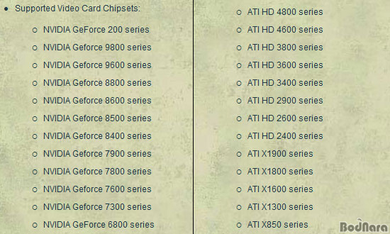 Æú¾Æ¿ô3°¡ Áö¿øÇÏ´Â ±×·¡ÇÈ Ä«µå´Â ¿£ºñµð¾Æ´Â ÁöÆ÷½º 6800 ½Ã¸®Áî ÀÌ»óºÎÅÍ ÁöÆ÷½º 7, 8, 9, ±×¸®°í 200 ½Ã¸®ÁîÀÇ ¸ÞÀνºÆ®¸² ÀÌ»óÀ», AMD¿¡¼´Â ATI ¶óµ¥¿Â X850 ½Ã¸®ÁîºÎÅÍ X1000, HD 2000, 3000, 4000 ½Ã¸®ÁîÀÇ ¸ÞÀνºÆ®¸² ÀÌ»ó Á¦Ç°µéÀÌ Æ÷ÇԵȴÙ.