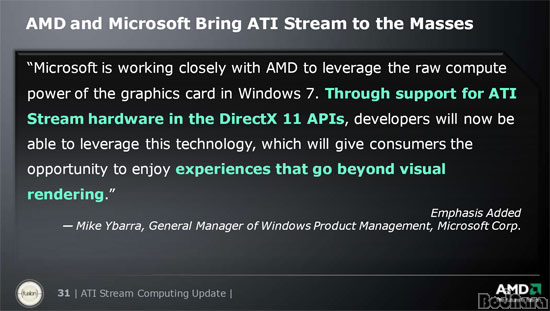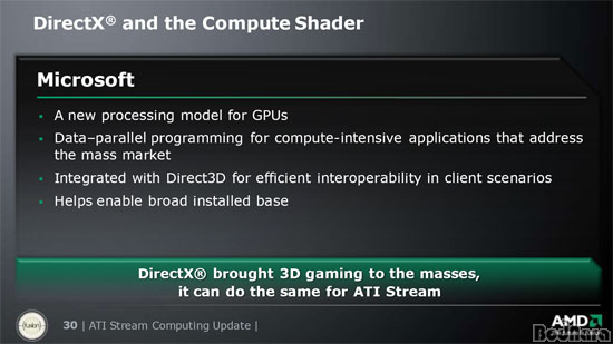 ¸¶ÀÌÅ©·Î¼ÒÇÁÆ®ÀÇ DirectX 11ºÎÅÍ´Â GPGPU Áö¿øÀ» À§ÇØ Compute Shader¸¦ µµÀÔÇÏ¿© GPU º´·Ä ÄÄÇ»ÆÃÀ» À§ÇÑ ±â¼úµéÀÌ Æ÷ÇԵǴµ¥ ¸¶ÀÌÅ©·Î¼ÒÇÁÆ® ¿ª½Ã ¸¹Àº ±â¾÷µé¿¡ ÀÇÇØ ÁöÁöµÇ¾î °ø°³ Ç¥ÁØÀ¸·Î Á¦½ÃµÈ OpenCLÀ» ¹þ¾î³ µ¶ÀÚÀûÀΠ±â¼úÀ» ¸¸µé±âº¸´Ù´Â À̸¦ È°¿ëÇϴ ¹æÇâÀÌ µÉ °ÍÀ¸·Î ¿¹»óµÇ¹Ç·Î ¿¬Àå¼±¿¡ Àִ ATI StreamÀº ¸¶ÀÌÅ©·Î¼ÒÇÁÆ®ÀÌ ÀÌ·± ¹æÇâÀ» Á¦´ë·Î Àû¿ëÇÒ ¼ö ÀÖ°í ¼·Î Çù·ÂÇÒ ¼ö ÀÖ°Ô µÈ´Ù.