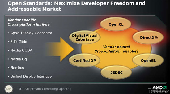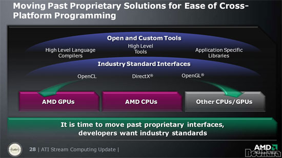 AMDÀÇ ATI StreamÀº °ø°³ Ç¥ÁØÀ» Áß½ÃÇÏ´Â Á¤Ã¥À» Æì³ª°¡°í Àִµ¥ ÀÌ·¯ÇÑ ÀÌÀ¯´Â °ú°Å ƯÁ¤ APIÀÇ °æ¿ì ÀϺΠÀα⸦ ´©¸®±âµµ ÇÏ¿´À¸³ª »çÀåµÇ¾ú´ø ±â¼úµéÀº ´ëºÎºÐ µ¶ÀÚ °³¹ßÇÑ ºñ°ø°³ ±â¼úµéÀ̾ú´Ù´Â Á¡À» µé¾ú´Ù.