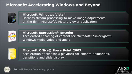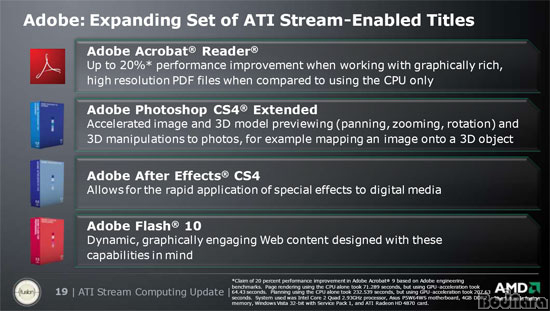 GPUÀÇ º´·Äó¸® ¼º´ÉÀÌ CPUÀÇ Ã³¸® ¼º´Éº¸´Ù ¿ì¼öÇÏ¿© À̸¦ CPU°¡ ÇÒ ¼ö ÀÖ´Â Àϵ鿡 Àû¿ëÇÑ´Ù°í ÇÒÁö¶óµµ À̸¦ Áö¿øÇϰí ÀÖ´Â ÇÁ·Î±×·¥µéÀÌ ¾ø´Ù¸é Àǹ̰¡ ¾ø´Ù. NVIDIA CUDAó·³ ATI Streamµµ ¹°¸®¿¬»êÀ̳ª ¾îµµºñ CS4 ÇÁ·Î±×·¥µé, ÆÄ¿öµð·ºÅÍ 7, ArcsoftÀÇ DVD ¾÷½ºÄÉÀϸµ ÇÁ·Î±×·¥, ¸¶ÀÌÅ©·Î¼ÒÇÁÆ®ÀÇ À©µµ¿ì ºñ½ºÅ¸³ª ÀÎÄÚ´õ, ÆÄ¿öÆ÷ÀÎÆ® 2007 µî ´Ù¾çÇÑ ATI Stream Áö¿ø ÇÁ·Î±×·¥µéÀÌ µîÀåÇϰí ÀÖ´Ù.