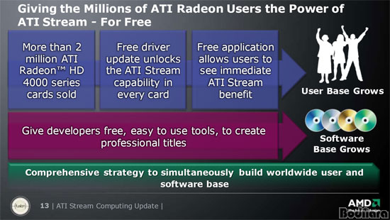 AMD¿¡¼ °ø°³ÇÑ ATI Stream SDK 1.3¿¡¼´Â Brook+ÀÇ ¼º´É Çâ»óÀ» ºñ·ÔÇÏ¿© FireStream 9270, Radeon HD 4600/ 4550/ 4350 µîÀÇ GPUµé¿¡¼µµ ATI StreamÀ» Ȱ¿ëÇÒ ¼ö ÀÖµµ·Ï ¸¸µé¾îÁÖ°í ÀÖ´Ù. ÀÌÈÄ 2009³â 1ºÐ±â °ø°³µÉ 1.4¹öÀü¿¡¼´Â ¸ÖƼ GPU Áö¿øÀ» ºñ·ÔÇÏ¿© µ¥ÀÌÅÍ °øÀ¯ ¹× 󸮿¡ Çâ»ó µîÀ» Á¦°øÇϸç, Radeon HD 4870 X2, FirePro 3D V3750/ V5700/ V7750/ V7770, V8700/ V8750ÀÇ GPUµéÀ» Ãß°¡·Î Áö¿øÇÒ °ÍÀ¸·Î ¾Ë·ÁÁö°í ÀÖ´Ù.