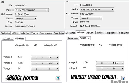 ¸Þ¸ð¸®´Â P545 PCB ±â¹Ý GeForce 9600GT ÀÏ¹Ý ¹öÀüÀÌ SAMSUNG 1.0ns GDDR3 (K4J52324QE-BJ1A) ¸Þ¸ð¸®¸¦ »ç¿ëÇÑ °Í°ú ´Þ¸® P562 PCB ±â¹Ý ½ºÆÄŬ GeForce 9600GT ÆÄ¿öÇ® ±×¸° 512MB´Â Hynix 1.0ns GDDR3 (H5RS5223CFR-N0C, 2.05V)¸¦ »ç¿ëÇÏ¿© µ¿ÀÛ¼Óµµ´Â °°°í ¸Þ¸ð¸® Á¦Á¶»ç¸¸ Â÷À̰¡ ÀÖ´Ù.