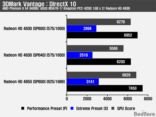 3DMark Vantage´Â DirectX 10 ȯ°æ¿¡¼ ±×·¡ÇÈ Ä«µåÀÇ ±âº» ¼º´ÉÀ» È®ÀÎÇÒ ¼ö Àִµ¥ °°Àº Ŭ·°ÀÌ Àû¿ëµÇ°í ÀÖÁö¸¸, SP800°ú SP640ÀÌ °¢°¢ Àû¿ëµÈ Radeon HD 4830Àº ¼·Î Â÷À̸¦ º¸¿´°í SP800 Radeon HD 4830ÀÌ ´õ ³ôÀº ¼º´ÉÀ» Á¦°øÇÑ´Ù. SP800 Radeon HD 4830Àº Radeon HD 4850 ·¹ÆÛ·±½º ¹öÀü¿¡ Ŭ·°¸¸ Â÷À̰¡ ÀÖÀ¸¹Ç·Î ±ÙÁ¢ÇÑ ¼º´ÉÀ» ³»ÁÖ°í ÀÖ´Ù.