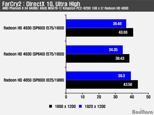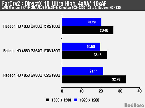 FarCry2µµ 3DMark Vantage¿Í °°ÀÌ DirectX 10 ȯ°æ¿¡¼ Å×½ºÆ®°¡ ÁøÇàµÇ¾úÀ¸¸ç, °íÇØ»óµµ¿Í ó¸® ¼º´ÉÀÌ ³ô¾ÆÁú¼ö·Ï SP800 Radeon HD 4830ÀÌ SP640 Radeon HD 4830À» ¾Õ¼´Â ¼º´ÉÀ» ³»ÁÖ¾ú´Ù. SP800 Radeon HD 4830Àº Radeon HD 4850°ú´Â Ŭ·° Â÷ÀÌ·Î ÀÎÇÏ¿© °íÇØ»óµµ¿Í ¾ÈƼ¾Ù¸®¾î½Ì (AA, Anti-Aliasing)°ú ºñµî¹æ¼º ÇÊÅ͸µ (AF, Anisotropic Filtering)ÀÌ µ¿½Ã¿¡ Àû¿ëµÇ¾î ó¸® ¼º´ÉÀÌ ´õ ¿ä±¸µÉ °æ¿ì ¼º´É Â÷À̰¡ ´õ Å©°Ô ³ªÅ¸³µ´Ù.