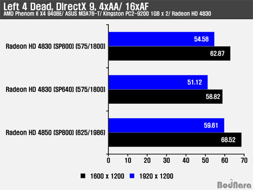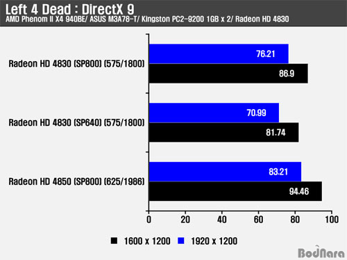 Left 4 Dead´Â ´Ù¸¥ °ÔÀÓ ¹× º¥Ä¡¸¶Å©¿Í ´Þ¸® DirectX 9 ȯ°æ¿¡¼ Å×½ºÆ®¸¦ ÁøÇàÇßÀ¸¸ç, À̹ø¿¡µµ SP800 Radeon HD 4830ÀÌ SP640 Radeon HD 4830°ú °°Àº Ŭ·°¿¡¼ ´õ ¸¹Àº ½ºÆ®¸² ÇÁ·Î¼¼¼¸¦ Á¦°øÇÔÀ¸·Î½á ó¸® ¼º´ÉÀÌ ´õ ³ô¾Ò´Ù. Radeon HD 4850Àº SP800 Radeon HD 4830°ú °°Àº 800°³ÀÇ ½ºÆ®¸² ÇÁ·Î¼¼¼¸¦ Á¦°øÇϳª Ŭ·° Â÷ÀÌ·Î ´õ ³ôÀº ó¸® ¼º´ÉÀÌ ¿ä±¸µÇ´Â °íÇØ»óµµ¿Í AA/ AF ȯ°æ¿¡¼ ¼º´É Â÷À̸¦ ³ªÅ¸³»Áá´Ù.