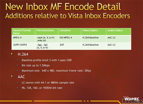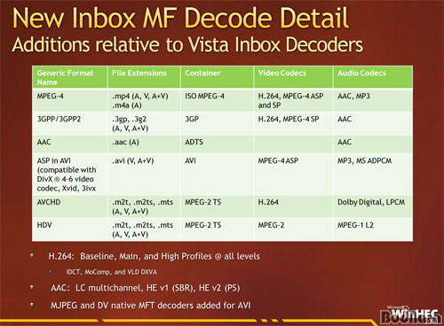 À©µµ¿ì 7ÀÌ Áö¿øÇϰí ÀÖ´Â ÆÄÀÏ Æ÷¸ËÀº MP4, AVI, Mov, 3GP, AVCHD, ADTS, M4A, DVR-MS, WTV°¡ ÀÖÀ¸¸ç, ³»ÀåµÈ ÄÚµ¦Àº H.264, MPEG4-SP, ASP/ DIVX/ Xvid, MJPEG, DV, AAC-LC, AAC-HE°¡ ÀÖ´Ù.