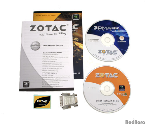 Ãß°¡ ±¸¼º¹°·Î´Â µÎ±ÇÀÇ »ç¿ëÀÚ ¸Å´º¾ó°ú, µå¶óÀ̹öCD, º¥Ä¡¸¶Å· ÇÁ·Î±×·¥ÀÎ 3D MARK VANTAGE°¡ µé¾îÀÖÀ¸¸ç, DVI to D-SUB º¯È¯Á¨´õ, Zotac ½ºÆ¼Ä¿°¡ Æ÷ÇԵǴ ÇÑÆí, SLI ÄÉÀ̺í°ú DVI to HDMI º¯È¯Á¨´õ´Â Á¦°øµÇÁö ¾Ê´Â´Ù.