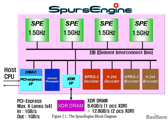 SpursEngine SE1000Àº µµ½Ã¹Ù°¡ CellÀÇ ¿ø·¡ ±¸¼ºÀÎ 8 SPE¿¡¼ 4°³ÀÇ SPE´Â ³²±â°í ³ª¸ÓÁö 4°³´Â Çϵå¿þ¾î ±â¹Ý MPEG-2/ H.264 ÀÎÄÚµù/ µðÄÚµùÀ» À§ÇÑ Çϵå¿þ¾î·Î ±³Ã¼ÇÏ¿© À̵é ó¸® °úÁ¤¿¡¼ ³ôÀº ¼º´ÉÀ» ºñ·ÔÇÏ¿© ¼ÒºñÀü·ÂÀ» ³·Ãâ ¼ö ÀÖµµ·Ï ±¸¼ºµÇ°í ÀÖ´Ù. ¿©±â¿¡ FlexIO ºÎºÐÀ» Á¦°ÅÇÑ ´ë½Å PCI-Express ºê¸´Áö¸¦ Ãß°¡ÇÏ¿© µ¥½ºÅ©Å¾ ȯ°æ µî¿¡ º¸´Ù ½±°Ô Àû¿ëÇÒ ¼ö ÀÖµµ·Ï ¸¸µé¾ú´Ù. (FlexIO´Â ÄÚµå¸í Redwood·Î Rambus°¡ °³¹ßÇÑ ±â¼ú·Î º´·Ä ÀÎÅÍÆäÀ̽ºÀÌ¸é¼ PCI-Expressº¸´Ù ³ôÀº 6.4GbpsÀÇ Àü¼Û·üÀ» Á¦°øÇÑ´Ù. FlexIOÀÇ ÆøÀº 96bits (12bytes)·Î ÃÖ´ë ´ë¿ªÆøÀº 76.8GB/s, PCI-Express 2.0 X16 LaneÀÌ ´Ü¹æÇâ 8GB/s·Î ¾ç¹æÇâ 16GB/sÀÇ ´ë¿ªÆøÀ» Á¦°øÇÑ´Ù.)