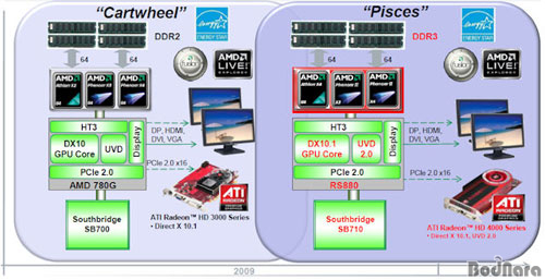 AMD 785G´Â DDR3 Áö¿ø °È¿Í DirectX 10.1 Áö¿ø, 45nm °øÁ¤ ÇÁ·Î¼¼¼µé°ú Á¶ÇյǾî Pisces Ç÷§ÆûÀ¸·Î ±¸ºÐµÇ°í ÀÖ´Ù.   AMD 780G + DX 10.1 & UVD2 = AMD 785G?