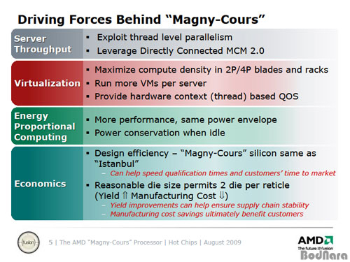 AMD°¡ ÄÁÆÛ·±½º¸¦ ÅëÇØ ¼Ò°³ÇÑ Á¦Ç°Àº 6ÄÚ¾î À̽ºÅººÒ CPU 2°³¸¦ ÀÌ¿ëÇÏ¿© ¸¸µé °ÍÀ¸·Î ¾Ë·ÁÁø 12ÄÚ¾î ÄÚµå¸í Magny-Cours·Î ¾Ë·ÁÁø ¼¹ö¿ë ÇÁ·Î¼¼¼´Ù. ÀÌ 12ÄÚ¾î ÇÁ·Î¼¼¼´Â ±âÁ¸¿¡ ¹ßÇ¥µÈ 6ÄÚ¾î À̽ºÅººÒ ¼¹ö ÇÁ·Î¼¼¼º¸´Ù ´õ ³ôÀº ¼º´ÉÀ» ³»ÁÖ¸é¼ °°Àº ¿¼³°è Àü·Â (TDP, Thermal Design Power) ¹üÀ§¸¦ °®´Â °ÍÀÌ Æ¯Â¡À¸·Î ¼Ò°³µÇ°í ÀÖ´Ù.