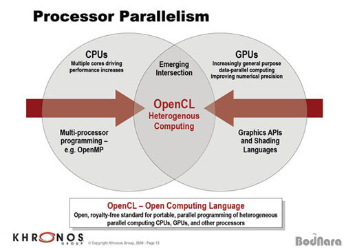 ÀÏÂïÀÌ º¸µå³ª¶ó¿¡¼µµ ±â»ç·Î ´Ù·é¹Ù ÀÖ´Â OpenCLÀº ±× µ¿¾È ¿£ºñµð¾Æ³ª AMD¿Í °°Àº ±×·¡ÇÈ Ä¨¼Â Á¦Á¶»çµéÀÌ GPU¸¦ ÀÌ¿ëÇÑ µ¶ÀÚÀûÀÎ º´·Ä ÄÄÇ»ÆÃ ±â¼ú(CUDA, ATI Stream)À» Á¦°øÇß´ø °Í°ú ´Þ¸®, CPU¿Í GPU¸¦ ºñ·ÔÇØ ´Ù¸¥ ÇÁ·Î¼¼¼µé¿¡¼µµ À̸¦ ÀÌ¿ëÇØ¼ ÄÄÇ»ÆÃ ¸®¼Ò½º¸¦ Á¦¾îÇÒ ¼ö ÀÖ°Ô ÇÏ´Â ÀÏÁ¾ÀÇ API °³³äÀÌ´Ù.