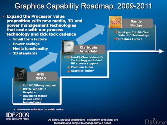 ÀÎÅÚ ÅëÇÕ GPUµµ ¼¼´ë°¡ Áö³ª°¨¿¡ µû¶ó ¼º´ÉÀ̳ª ±â´ÉÀÌ Ãß°¡µÇ´Â ·Îµå¸ÊÀÌ Á¸ÀçÇÑ´Ù. IDF 2009¿¡¼ °ø°³µÈ ·Îµå¸ÊÀº Ŭ¶ôµ¥ÀÏ/¾Ö·±µ¥ÀÏ·Î Ãâ½ÃµÇ´Â ¿þ½ºÆ®¹Ì¾î µ¥½ºÅ©Å¾/³ëÆ®ºÏ CPU¿¡ ±âÁ¸ G45¿¡ µé¾î°¬´ø GMA X4500HDº¸´Ù °ÈµÈ µà¾ó ½ºÆ®¸²À» Áö¿øÇÏ´Â ÀÎÅÚ Å¬¸®¾î ºñµð¿À HD ±â¼ú°ú ÇÁ¸®¹Ì¾ö ¿Àµð¿À, ±×¸®°í ³×ÇÒ·½ ¾ÆÅ°ÅØÃ³¿¡ µé¾î°¬´ø Åͺ¸ ºÎ½ºÆ®¿Í À¯»çÇÑ Å¬·° Á¶Àý ±â´É ±×·¡ÇȽº Åͺ¸(Graphics Turbo)°¡ µé¾î°£´Ù. ¿ÏÀüÇÑ CPU+GPU ¾ÆÅ°ÅØÃ³ÀÎ »÷µðºê¸´Áö´Â Â÷¼¼´ë ÀÎÅÚ Å¬¸®¾î ºñµð¿À HD ±â¼ú°ú ±×·¡ÇȽº Åͺ¸+°¡ µé¾î°¥ ¿¹Á¤ÀÌ´Ù.