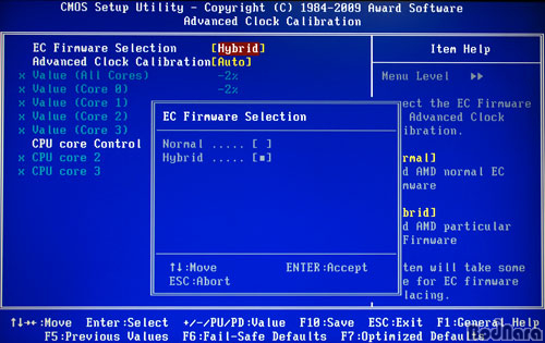 GIGABYTE GA-MA785G-UD3H ¸ÞÀκ¸µå´Â ACC ¼³Á¤ ¿Ü¿¡µµ EC Firmware Selection Ç׸ñÀÌ Ãß°¡µÇ°í ÀÖ´Ù. NormalÀº AMD ³ë¸Ö EC Æß¿þ¾î ¹öÀüÀ» ÀÌ¿ëÇÏ´Â °ÍÀ̰í Hybrid´Â AMD ƯÁ¤ EC Æß¿þ¾î¸¦ Àû¿ëÇÏ´Â °ÍÀ¸·Î ³ªÅ¸³ª´Âµ¥ ÄÚ¾î °³Á¶¿¡´Â Hybrid¸¦ ¼±ÅÃÇÏ´Â °ÍÀ» ±ÇÀåÇϰí ÀÖÀ¸¸ç, ACC ¸ðµå´Â º¸Åë Auto¸¦ ¼±ÅÃÇϰí ÀÖ´Ù. ´Ù¸¥ Á¦Á¶»çµéÀÇ ¸ÞÀκ¸µåÀÇ °æ¿ì ACC ¸ðµå¸¦ Á¦°øÇϴµ¥ Auto¸¦ ¼±ÅÃÇÏ¿© ÄÚ¾î °³Á¶¸¦ ÁøÇàÇÒ ¼ö ÀÖ´Ù.