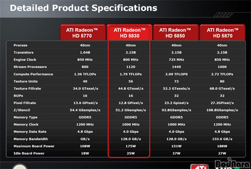 [¶óµ¥¿Â HD 5830Àº ¶óµ¥¿Â HD 5850°ú HD 5770 »çÀÌÀÇ ½ºÆå] ÄÄÇ»ÆÃ ¼º´ÉÀº ±âÁ¸ ¶óµ¥¿Â HD 4800 ½Ã¸®Á´Ù Å©°Ô ´Ã¾î³ ½ºÆ®¸² ÇÁ·Î¼¼¼ µîÀ» ÅëÇØ 2TeraFLOPs ÀÌ»óÀÇ Ã³¸® ´É·ÂÀ» Á¦°øÇϴµ¥ ¶óµ¥¿Â HD 5870Àº 3TeraFLOPs¿¡ °¡±î¿î 2.72TeraFLOPs, HD 5850Àº 2.09TeraFLOPs¸¦ Á¦°øÇÑ´Ù. ¹Ý¸é, ½ºÆ®¸² ÇÁ·Î¼¼¼°¡ ÁÙ¾îµç ¶óµ¥¿Â HD 5830Àº 1.79TeraFLOPs¸¦ Á¦°øÇØ 2TeraFLOPs¿¡ ¸ø¹ÌÄ¡´Â ÄÄÇ»ÆÃ ¼º´ÉÀ» Á¦°øÇÑ´Ù. ¶óµ¥¿Â HD 5830Àº ¶óµ¥¿Â HD 5858°ú HD 5770 »çÀÌÀÇ ½ºÆåÀ» °¡Áö´Âµ¥ ½ºÆ®¸² ÇÁ·Î¼¼¼´Â 1120°³·Î HD 5870ÀÇ 1600°³, HD 5850ÀÇ 1440°³º¸´Ù ÁÙ¾ú´Ù. ÅØ½ºÃ³ À¯´Öµµ 56°³ (14 ÅØ½ºÃ³ À¯´Ö, 4 ÅØ½ºÃ³ ¾îµå·¹½º À¯´ÖÀ¸·Î ÃÑ 56°³, 14 FP32 ÅØ½ºÃ³ »ùÇ÷¯·Î ÃÑ 224°³, 4 FP32 ÅØ½ºÃ³ ÇÊÅ͸µ À¯´ÖÀ¸·Î ÃÑ 56°³)·Î ÁÙ¾î HD 5870ÀÇ 80°³ (20°³ÀÇ ÅØ½ºÃ³ À¯´Ö (4 ÅØ½ºÃ³ ¾îµå·¹½º À¯´ÖÀ¸·Î ÃÑ 80°³, 16 FP32 ÅØ½ºÃ³ »ùÇ÷η¯ ÃÑ 320°³, 4 FP32 ÅØ½ºÃ³ ÇÊÅ͸µ À¯´ÖÀ¸·Î ÃÑ 80°³)), HD 5850ÀÇ 72°³  (18°³ÀÇ ÅØ½ºÃ³ À¯´Ö (4 ÅØ½ºÃ³ ¾îµå·¹½º À¯´ÖÀ¸·Î ÃÑ 72°³, 16 FP32 ÅØ½ºÃ³ »ùÇ÷η¯ ÃÑ 288°³, 4 FP32 ÅØ½ºÃ³ ÇÊÅ͸µ À¯´ÖÀ¸·Î ÃÑ 72°³))º¸´Ù ÁÙ¾î ÅØ½ºÃ³ ó¸® ´É·Âµµ °¨¼ÒµÇ¾ú´Ù. HD 5800 ½Ã¸®Áî´Â °íÇØ»óµµ ¾ÈƼ¾Ù¸®¾î½Ì ¼º´É ÀúÇϸ¦ °³¼±Çϱâ À§ÇØ HD 4800 ½Ã¸®Á´Ù 2¹è ´Ã¾î³ 32 ROP¸¦ Á¦°øÇϰí Àִµ¥ ¶óµ¥¿Â HD 5870°ú HD 5850¸¸ ÀÌ¿¡ ÇØ´çÇϸç, ¶óµ¥¿Â HD 5830Àº HD 4890/ 4870°ú °°Àº 16 ROP°¡ Àû¿ëµÈ´Ù. ÀÌ¿¡ µû¶ó »óÀ§ Á¦Ç°µéº¸´Ù AA/ AF 󸮿¡¼ »ó´ëÀûÀ¸·Î ³·Àº ¼º´ÉÀÌ ¿¹»óµÈ´Ù. ÇÏÁö¸¸, AA/ AF󸮿¡ 1120°³·Î ´Ã¾î³ ½ºÆ®¸² ÇÁ·Î¼¼¼¿Í 16 ROP¸¦ ÀÌ¿ëÇÏ´Â HD 5830Àº °íÇØ»óµµ ¾ÈƼ¾Ù¸®¾î½Ì ȯ°æ¿¡¼ ±âÁ¸ ¶óµ¥¿Â HD 4800 ½Ã¸®Áîµéº¸´Ù AA/ AF ó¸® ¼º´ÉÀº °³¼±µÈ °ÍÀ¸·Î ¿¹»óµÈ´Ù. HD 5800 ½Ã¸®Áî¿¡ ¼ÓÇÏ´Â ¶óµ¥¿Â HD 5830Àº AF (Anisotropic Filtering, ºñµî¹æ¼ºÇÊÅ͸µ (AMD ATI) ¶Ç´Â À̹漺ÇÊÅ͸µ (NVIDIA)·Î Ç¥±â)ÀÇ »õ·Î¿î ¾Ë°í¸®Áò µµÀÔÀ» ÅëÇØ AF È¿À²°ú ¼º´É ¿ª½Ã °³¼±Çß´Ù. HD 5830Àº °íŬ·° GDDR5 SDRAM ¸Þ¸ð¸® »ç¿ë ¹× ÀÌ¿¡ ÃÖÀûÈµÈ Hub ¸Þ¸ð¸® ÄÁÆ®·Ñ·¯¸¦ Á¦°øÇÑ´Ù. ƯÈ÷, GDDR5 ¸Þ¸ð¸®´Â ÀÌÀü HD 4800 ½Ã¸®Áî¿¡¼ ¹®Á¦µÇ¾ú´ø °íÁ¤ Ŭ·° ¹× Àü¾ÐÀ» °³¼±ÇÏ¿© ½ºÀ§ÄªÀÌ °¡´ÉÇϵµ·Ï º¯°æµÇ¾ú°í »óȲ¿¡ µû¸¥ ºÎÇϸ¦ °¨ÁöÇÒ ¼ö ÀÖÀ¸¸ç, ¿¡·¯Á¤Á¤Äڵ带 Æ÷ÇÔÇϰí ÀÖ´Ù. ¶ÇÇÑ, »ç¿ëµÇÁö ¾ÊÀ»½Ã ȸ·Î¸¦ ²ô°í Àü·ÂÀ» ÁÙÀÏ ¼ö ÀÖ°í ¸ÖÆ¼ GPU ±¸¼ºÀÎ CrossFire ±¸¼º½Ã¿¡µµ »ç¿ëµÇÁö ¾ÊÀº »óȲ¿¡¼´Â ÇϳªÀÇ ±×·¡ÇÈÄ«µå¸¦ »ç¿ëÇÏÁö ¾Êµµ·Ï Â÷´ÜÇÏ¿© ÀÌÀü ¼¼´ëº¸´Ù ¼ÒºñÀü·ÂÀ» Å©°Ô ÁÙÀÏ ¼ö ÀÖ°Ô µÇ¾ú´Ù. ÀÌ °á°ú ¾ÆÀÌµé »óȲ¿¡¼ ÄÚ¾î Ŭ·°°ú ÇÔ²² ¸Þ¸ð¸® Ŭ·°µµ Å©°Ô ³·¾ÆÁ® AMD ATI´Â 25W ¼öÁØÀ¸·Î ³·¾ÆÁ³´Ù°í ¹àÈ÷°í ÀÖ´Ù. ¶Ç, ÃÖ´ë 6°³ÀÇ ¸ð´ÏÅ͸¦ Áö¿øÇÒ ¼ö ÀÖµµ·Ï °³¼±µÈ µð½ºÇ÷¹ÀÌ ÄÁÆ®·Ñ·¯ (ATI Eyefinity ±â¼ú)µµ Ãß°¡µÇ¾ú´Ù. µð½ºÇ÷¹ÀÌ ÄÁÆ®·Ñ·¯´Â ATI Eyefinity (¾ÆÀÌÇÇ´ÏÆ¼) ±â¼úÀ» Áö¿øÇϸç, 6°³ÀÇ 10bit µð½ºÇ÷¹ÀÌ ÆÄÀÌÇÁ¶óÀÎÀ» ÅëÇØ À¯¿¬¼º ÀÖ´Â Ãâ·Â ¸ðµå¸¦ ±¸¼ºÇÒ ¼ö ÀÖ´Ù. µà¾ó¸µÅ© DVI ±¸¼º½Ã´Â TMDS/DP µð½ºÇ÷¹ÀÌ ÆÄÀÌÇÁ¶óÀÎÀ» 2°³ Á¡À¯ÇØ Ãâ·ÂÇÏ´Â ±¸¼ºÀ̸ç, µð½ºÇ÷¹ÀÌ Æ÷Æ® (DisplayPort)¸¦ ¹Ýµå½Ã Æ÷ÇÔÇØ¾ß ¸ð´ÏÅÍ È®Àå ±â¼úÀÎ ¾ÆÀÌÇÇ´ÏÆ¼¸¦ ±¸¼ºÇÒ ¼ö ÀÖ´Ù. HD 5870 Eyefinity6 ¿¡µð¼ÇÀº TMDS/ DP µð½ºÇ÷¹ÀÌ ÆÄÀÌÇÁ¶óÀÎÀ» °³º°·Î Çϳª¾¿ µð½ºÇ÷¹ÀÌ Æ÷Æ® (DP, DisplayPort)·Î Ãâ·ÂÇÏ¿© ÃÑ 6°³ÀÇ ¸ð´ÏÅÍ Ãâ·ÂÀÌ