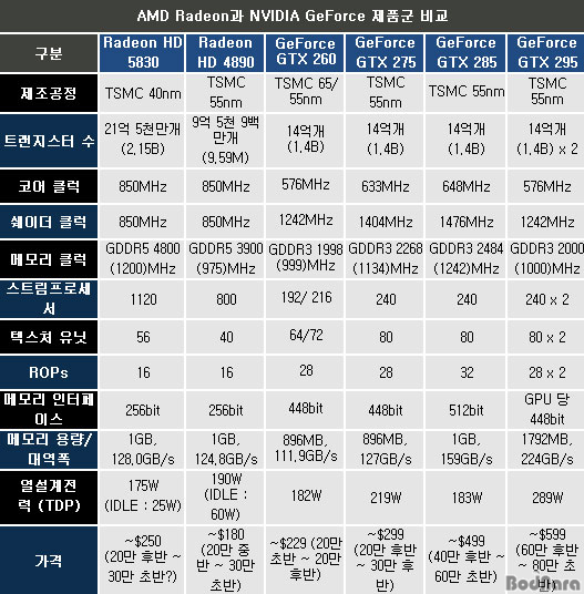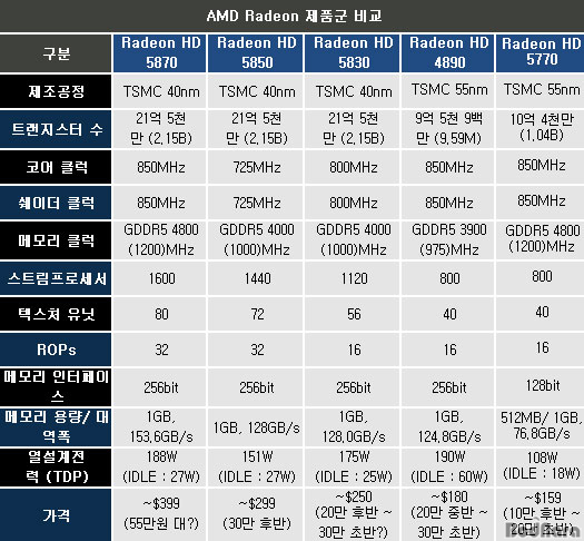 ¶óµ¥¿Â HD 5830Àº ´Ù¸¥ ¶óµ¥¿Â HD 5800 ½Ã¸®Áî¿Í °°ÀÌ 40nm °øÁ¤À¸·Î Á¦Á¶µÇ¸ç, 21¾ï 5õ¸¸ °³ÀÇ Æ®·£Áö½ºÅͰ¡ ÁýÀûµÈ´Ù. Àû¿ëµÈ Ŭ·°Àº ¶óµ¥¿Â HD 5850º¸´Ù ³ô°í ¶óµ¥¿Â HD 5870º¸´Ù ³·Àº ÄÚ¾î 800/ ¸Þ¸ð¸® 4000 (1000)MHz°¡ Àû¿ëµÇ°í ¸Þ¸ð¸® ÀÎÅÍÆäÀ̽º´Â 256bit·Î °°´Ù. ¶óµ¥¿Â HD 5830Àº ½ºÆ®¸² ÇÁ·Î¼¼¼¿Í ÅØ½ºÃ³ À¯´Ö, ROP´Â ¶óµ¥¿Â HD 5870°ú HD 5850ÀÇ 1600/ 80/ 32 ROP, 1440/ 72/ 32 ROPº¸´Ù ³·¾ÆÁø 1120/ 56/ 16 ROP·Î ½ºÆåÀÌ Àü¹ÝÀûÀ¸·Î ÁÙ¾î °¡°Ý´ë¿¡ ¸Âµµ·Ï ¼º´ÉÀ» Á¶ÀýÇß´Ù. ¿¼³°èÀü·ÂÀÎ TDP´Â HD 5870ÀÌ ¾ÆÀ̵éÀº 27W, Ç®·Îµå´Â 188W, HD 5850Àº 27W/ 170W·Î Ãʱ⿡ ¾Ë·ÁÁ³À¸³ª 151W·Î ³ªÅ¸³µÀ¸¸ç, ¶óµ¥¿Â HD 5830Àº Ŭ·° Áõ°¡·Î ÀÎÇÑ °ÍÀÎÁö ¶óµ¥¿Â HD 5850º¸´Ù ·Îµå½Ã 24W°¡ Áõ°¡µÇ¾ú°í ¾ÆÀ̵éÀº ¿ÀÈ÷·Á 2W°¡ ÁÙÀº °ÍÀ¸·Î ³ªÅ¸³ª°í ÀÖ´Ù. ±âÁ¸ 55nm °øÁ¤ Á¦Ç°µéº¸´Ù´Â Àü¹ÝÀûÀ¸·Î ³·¾ÆÁ³´Ù. ¶óµ¥¿Â HD 5870ÀÌ 50¸¸¿ø ÈĹÝ, HD 5850ÀÌ 30¸¸¿ø ÈĹݴëÀÇ °¡°ÝÀ» Çü¼ºÇϰí Àִµ¥ ¶óµ¥¿Â HD 5830Àº ¶óµ¥¿Â HD 4890ÀÌ Â÷ÁöÇϰí ÀÖ´Â 20¸¸¿ø ÈĹݿ¡¼ 30¸¸¿ø ÃÊ¹Ý ´ëÀÇ °¡°ÝÀ» Çü¼ºÇÒ °ÍÀ¸·Î ¿¹»óµÈ´Ù.     AMD¿Í NVIDIA Á¦Ç°±º ºñ±³