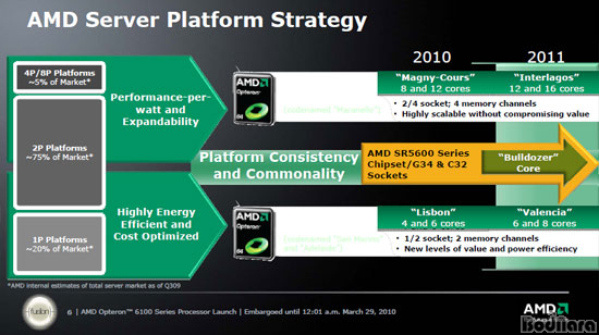 AMD ¼¹ö Ç÷§Æû Àü·«¿¡ µû¸£¸é ¿À´Ã ³¯ÀÇ ¼¹ö ½Ã½ºÅÛÀº CPU ¼ÒÄÏ ¼ö, ±×¸®°í ÇϳªÀÇ CPU¿¡ ¸î °³ÀÇ Äھ Á¦°øÇϴ°¡·Î ±¸ºÐµÈ´Ù. Àüü ¼¹ö ½ÃÀåÀÇ Á¡À¯À²À» º¸¸é 1P Ç÷§ÆûÀº 20%, 2P Ç÷§ÆûÀº 75%, ±×¸®°í 4P/8P Ç÷§ÆûÀº 5% ¹Ì¸¸¿¡ ÇØ´çµÈ´Ù.