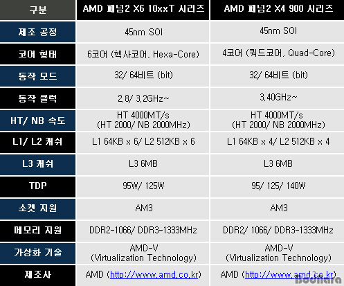 AMD ÄõµåÄÚ¾î Æä³Ñ2 X4 900 ½Ã¸®Áî¿Í 6ÄÚ¾î Æä³Ñ2 X6 ½Ã¸®ÁîÀÇ ±âº»ÀûÀÎ ½ºÆåÀ» ºñ±³Çغ¸¸é °°Àº AM3 ¼ÒÄÏÀ» Àû¿ëÇÏ¿© ±âÁ¸ AM2+/ AM3 ¼ÒÄÏ ¸ÞÀκ¸µå¿¡ ȣȯÀÌ °¡´ÉÇϸç, °øÁ¤ ±â¼ú°ú 32/ 64ºñÆ® Áö¿ø, Àû¿ë Ŭ·°µµ ÄõµåÄÚ¾î¿Í Å©°Ô Â÷À̰¡ ¾ø´Ù.