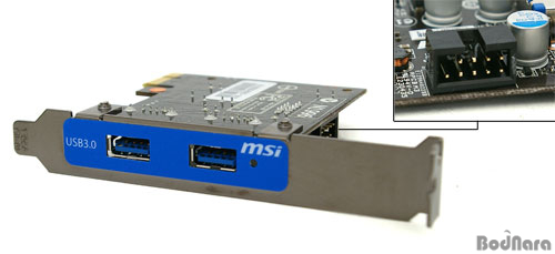 MSI STAR-USB3´Â PCI Express x1 ¹æ½ÄÀÇ USB 3.0 ÀÎÅÍÆäÀ̽º Ä«µå·Î, MSIÀÇ ¸ÞÀκ¸µå¸¦ ºñ·ÔÇØ ´Ù¼öÀÇ ¸ÞÀκ¸µå¿¡ äÅÃµÈ NECÞäÀÇ USB 3.0 ÄÁÆ®·Ñ·¯ D720200F1À» »ç¿ëÇßÀ¸¸ç, PCB Å©±â´Â 65mm x 68mm ÀÌ´Ù.