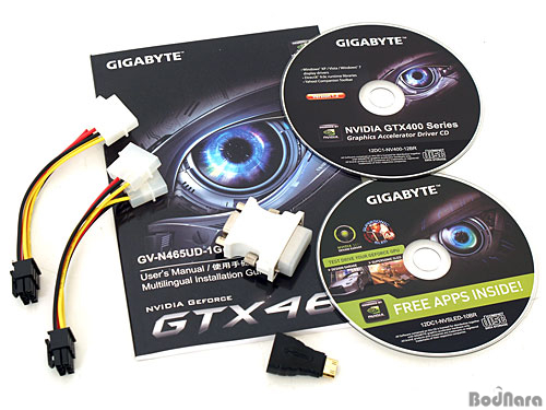 »ùÇ÷ΠÁ¦°øµÈ ±â°¡¹ÙÀÌÆ® ÁöÆ÷½º GTX 465¿¡´Â Á¦°øµÇ´Â ±¸¼º¹°Àº »ç¿ëÀڸŴº¾ó, 12V 4ÇÉ to PCIe 6ÇÉ º¯È¯ ÄÉÀ̺í 2°³, µå¶óÀ̹ö CD 1Àå, DirectX11°ú CDUA ±â¼ú Áö¿ø µ¥¸ðÀÎ SuperSonic Sled¿Í Design Garage ÇÁ·Î±×·¥ CD 1Àå, DVI to D-SUB º¯È¯Àè, Mini HDMI to HDMI º¯È¯ÀèÀ» Á¦°øÇÑ´Ù.