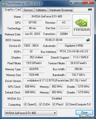 [±â°¡¹ÙÀÌÆ® GTX 465 (ÄÚ¾î 608/ ¸Þ¸ð¸® 3208 (802)/ ½¦ÀÌ´õ 1215MHz)]