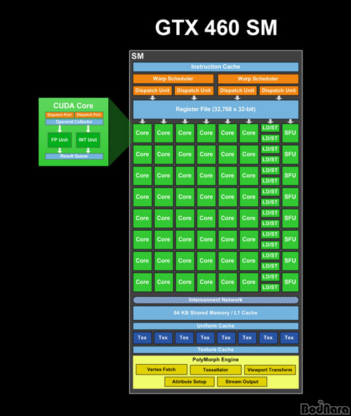 ÁöÆ÷½º GTX 460 ½Ã¸®Áî¿¡ »ç¿ëµÈ GF104ÀÇ SM (Streaming Multiprocessor) ±¸¼ºÀº GF100°ú ´Þ¶óÁ³´Ù. °¡Àå Å« º¯È·Î´Â 32°³ (16°³ÀÇ 2ºí·°±¸Á¶)ÀÇ Äí´ÙÄÚ¾î (CUDA Cores)¿¡¼ 48°³ (16°³ÀÇ 3ºí·°±¸Á¶)ÀÇ Äí´ÙÄھ ³»ÀåµÈ °ÍÀ¸·Î ÀÌ´Â ½ÇÁ¦ ½ÇÇà À¯´ÖÀÇ ºñÀ²ÀÌ ³ô¾ÆÁö°í ÅØ½ºÃ³ À¯´Öµµ 4°³¿¡¼ 2¹èÀÎ 8°³·Î Å©°Ô ´Ã¾î³ª ±×·¡ÇÈ¿¬»ê¿¡¼ ´õ ³ôÀº ó¸® ¼º´ÉÀ» ³»ÁÙ ¼ö ÀÖ°Ô ±¸Á¶°¡ º¯°æµÇ¾ú´Ù. Æú¸®¸ðÇÁ ¿£ÁøÀÇ ±¸¼ºÀº ±âÁ¸°ú °°°í Å×¼¿·¹ÀÌÅͰ¡ Æú¸®¸ðÇÁ ¿£Áø¸¶´Ù 1°³¾¿ ³»ÀåµÇ¾î SMÀÌ ÃÑ 8°³ »ç¿ëµÈ GF104´Â 8°³ÀÇ Å×¼¿·¹ÀÌÅ͸¦ º´·Ä·Î ó¸®ÇÒ ¼ö ÀÖ´Ù.