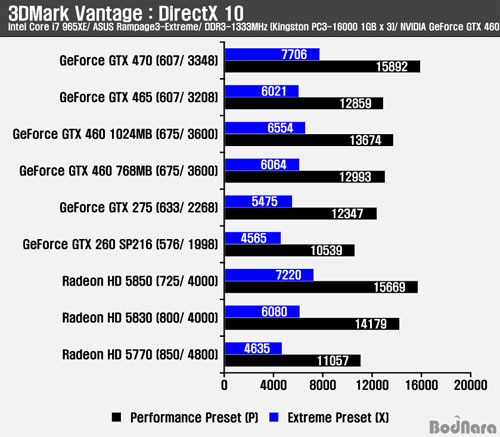·¹ÆÛ·±½º Á¦Ç°À» ÀÌ¿ëÇÑ 3D Mark Vantage Å×½ºÆ® °á°ú¸¦ º¸¸é GTX 460 768MBÀÇ °æ¿ì »óÀ§ ÆÛÆ÷¸Õ½º Á¦Ç°ÀÎ GTX 465¿Í ±ÙÁ¢ÇÑ ¼º´ÉÀ» º¸À̰í, GTX 460 1024MB Á¦Ç°ÀÇ °æ¿ì GTX 460º¸´Ù Çâ»óµÈ ¼º´ÉÀ» º¸¿©, ¸ÞÀνºÆ®¸² °¡°Ý¿¡ ÆÛÆ÷¸Õ½º ±Þ ¼º´ÉÀ» ¿øÇÏ´Â »ç¿ëÀÚ¿¡°Ô ´ë¾ÈÀÌ µÉ °ÍÀ¸·Î º¸ÀδÙ.