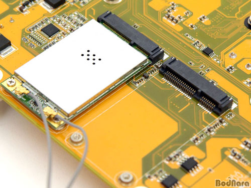 2°³ÀÇ mini PICe ½½·Ô °¡¿îµ¥ Çϳª¿¡´Â 802.11b/g/n ¹«¼±·£À» Áö¿øÇϱâ À§ÇÑ ¹«¼±·£ Ä«µå°¡ ´Þ·ÁÀÖÁö¸¸, ³ª¸ÓÁö Çϳª´Â ºñ¾î ÀÖ¾î mini PICe Áö¿ø Ä«µå¸¦ Ãß°¡ ÀåÂøÇÒ ¼ö ÀÖ´Ù. ±×·¯³ª ¾Õ¿¡¼ ¼³¸íÇßµíÀÌ ¸ÞÀκ¸µå¿¡ ¿ö·±Æ¼ ¾ÁÀÌ ºÙ¾îÀÖ¾î ÀÌ ½½·ÔÀ» »ç¿ëÇϱâ À§ÇØ º¸µå¸¦ ÄÉÀ̽º¿¡¼ Á¦°ÅÇÏ¸é ¿ö·±Æ¼ º¸ÁõÀ» ¹ÞÁö ¸øÇÑ´Ù.