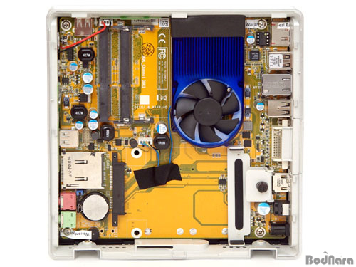 ZOTAC HD-ND22ÀÇ ³»ºÎ ±¸Á¶¸¦ º¸¸é ±âÁ¸ÀÇ ZOTAC ¹Ì´Ï PCµéó·³ mini-ITX µðÀÚÀÎÀÇ ¸ÞÀκ¸µå¸¦ »ç¿ëÇØ ÃʼÒÇü PC¸¦ ¸¸µé¾úÀ½À» ¾Ë ¼ö ÀÖ´Ù. °ø°£ Àý¾àÀ» À§ÇØ ³»ºÎ ºÎǰÀº µ¥½ºÅ©Å¾ÀÌ ¾Æ´Ñ ¸ð¹ÙÀÏ¿ë HDD¿Í ¸Þ¸ð¸®°¡ µé¾î°£´Ù.