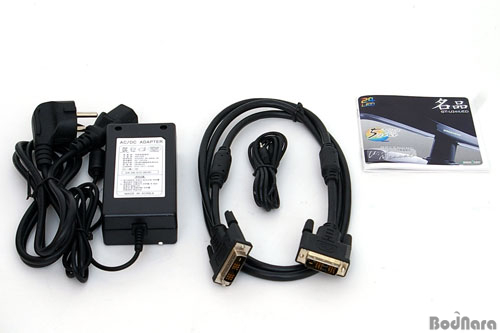 Á¦Ç° »ç¿ë¿¡ ÇÊ¿äÇÑ DVI ÄÉÀ̺í°ú ½ºÅ×·¹¿À »ç¿îµå ¿¬°á Àè, 12V/5A Àü¿ø ¾î´ðÅÍ¿Í Á¦Ç° ¼³¸í¼°¡ Á¦°øµÈ´Ù.
