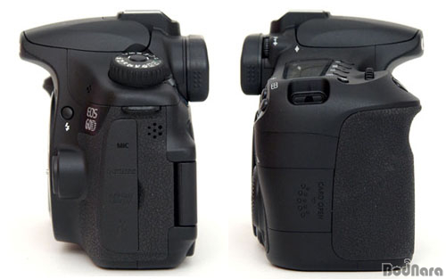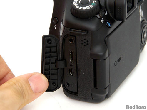 ÁÂÃø¿¡´Â µ¿¿µ»ó ÃÔ¿µ½Ã ¿ÜºÎ ¼Ò¸®¸¦ ÀÔ·ÂÇϱâ À§ÇÑ MIC ´ÜÀÚ¿Í mini-HDMI Ãâ·Â Æ÷Æ®, USB ¹× A/V ¿¬°á Æ÷Æ®, ±×¸®°í À¯¼± ¸®¸ðÄÜ ¸±¸®Áî ´ÜÀÚ°¡ ´Þ·ÁÀÖ´Ù. µ¿¿µ»ó ÃÔ¿µ¿ë MIC ´ÜÀÚ°¡ µé¾î°£ ´ë½Å 50D¿¡´Â ÀÖ¾ú´ø ¿ÜºÎ Ç÷¡½Ã À¯¼± Ä¿³ØÅͰ¡ ºüÁ³´Ù.
