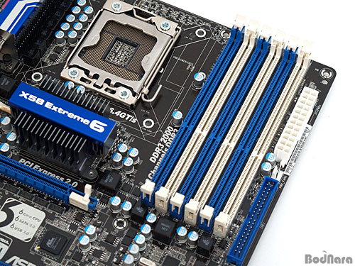 ¸Þ¸ð¸® ½½·ÔÀº ¸ðµÎ 6°³¸¦ Á¦°øÇϸç, X58°ú LGA1366 ±â¹Ý CPU´Â 3½ÖÀÇ DDR3 ¸Þ¸ð¸®·Î Æ®·¡Çà ä³Î ¸Þ¸ð¸® ±¸¼ºÀ» Áö¿øÇÑ´Ù. Áö¿ø °¡´ÉÇÑ ¸Þ¸ð¸® ¿ë·®Àº 24GB·Î ½½·ÔÀÌ °øÀ¯µÇ¾î ½½·Ô ´ç 4GB°¡ ÃÖ´ë Áö¿ø ¿ë·®ÀÌ´Ù. ¸Þ¸ð¸®´Â DDR3¸¦ Áö¿øÇÏ°í ¼³Ä¡´Â ÇϾá»ö ÁÂÃø 1¹øºÎÅÍ 3°³¸¦ ½ÖÀ¸·Î ¼³Ä¡Çϵµ·Ï ±ÇÀåÇϰí ÀÖÀ¸¸ç, ¸Þ¸ð¸® Ŭ·°Àº DDR3-1066MHz °ø½Ä Áö¿ø¿¡ ¿À¹öŬ·°À» ÅëÇØ 1333/ 1600/ 1866/ 2000MHz±îÁö Áö¿øÀÌ °¡´ÉÇØÁø´Ù.